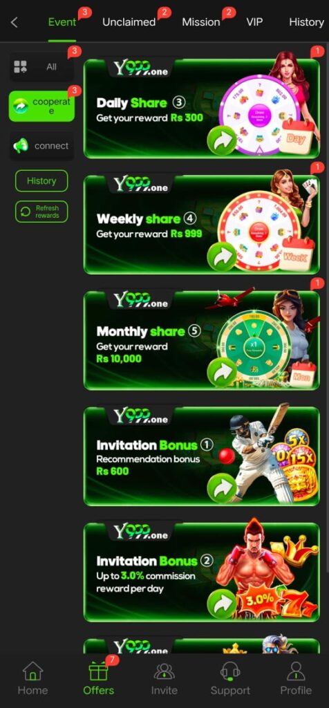 Welcome bonus, daily login bonus, deposit bonus, referral commissions and free spins, weekly/monthly rewards.